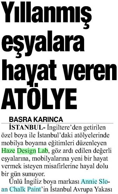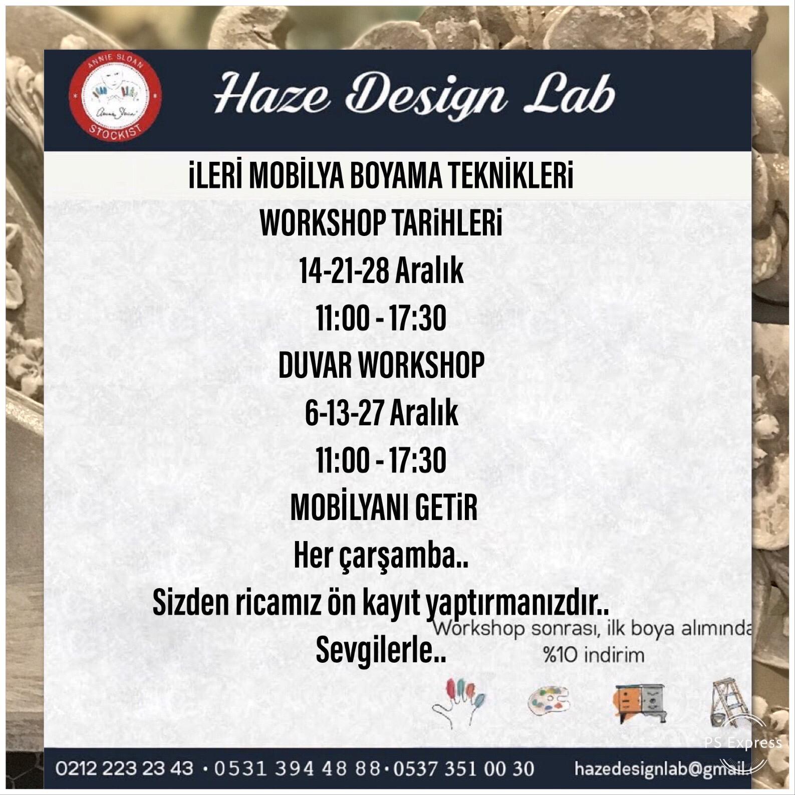 İngiltere'den getirilen özel boya ile İstanbul'daki atölyelerinde mobilya boyama eğitimleri düzenleyen Haze Design Lab, göz ardı edilen değerli eşyalarına, mobilyalarına yeni bir hayat vermek isteyen misafirlerine hayal dolu bir gün sunuyor.